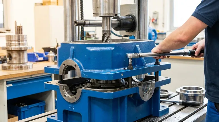Em seguida, uma máquina de mandrilamento de alta precisão corta os furos para os eixos e rolamentos através de ambas as metades simultaneamente. Este processo garante que os dois semicírculos resultantes sejam perfeitamente combinados e concêntricos.
