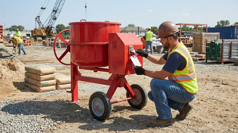 Crucialmente, a betoneira deve ser claramente marcada. Use um sistema de bloqueio/etiquetagem (lockout/tagout) com uma etiqueta que declare claramente "Não Operar" e descreva o perigo identificado.